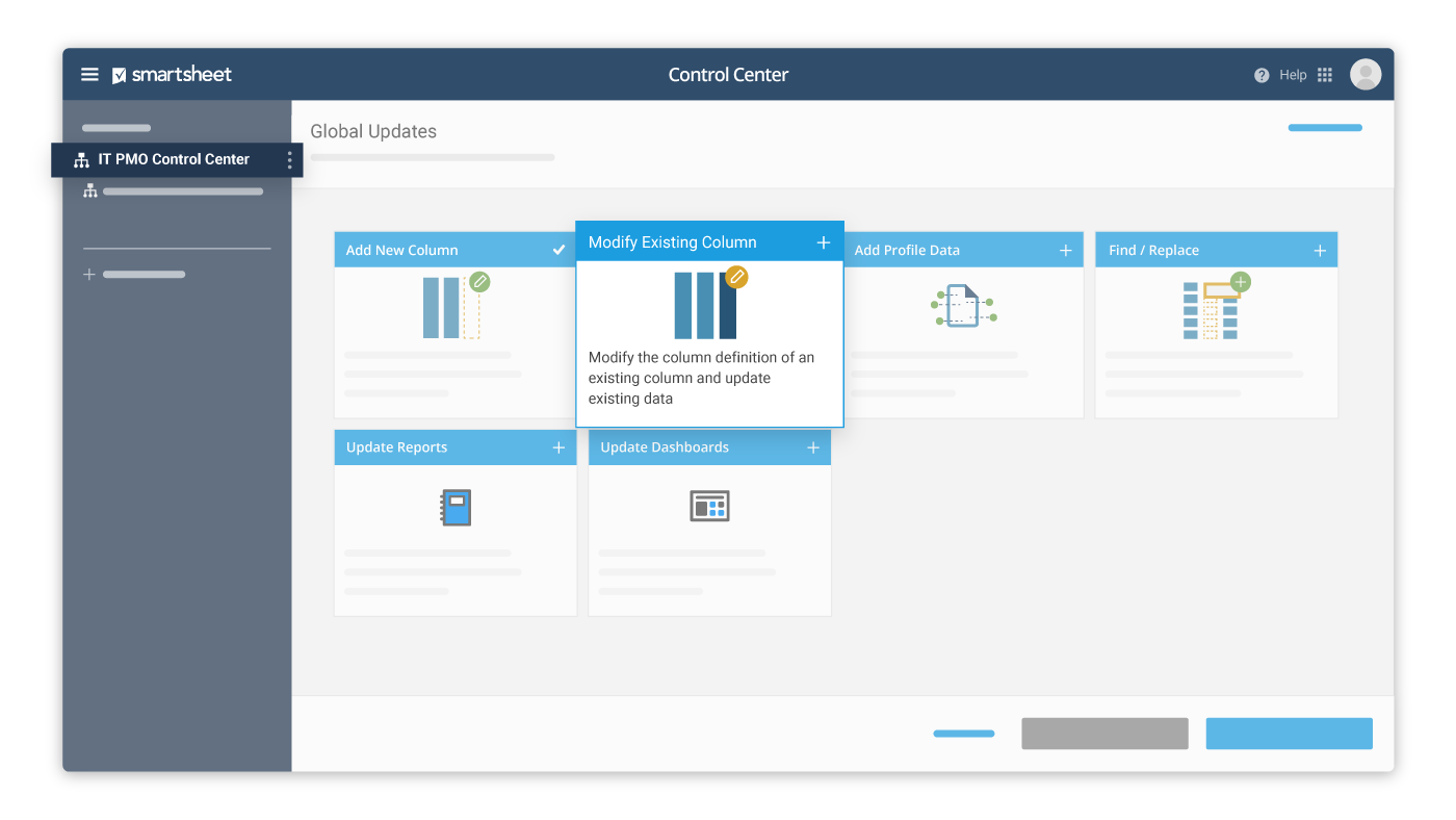 Whether you’re ready to build solutions to rollout across regions, across departments, or outside the organization, we have Project Portfolio Management (PPM) solutions powered by Smartsheet to support your needs. Using Smartsheet Control Center, build and manage solutions at scale—reducing repetitive inputs and providing more data-driven insights.